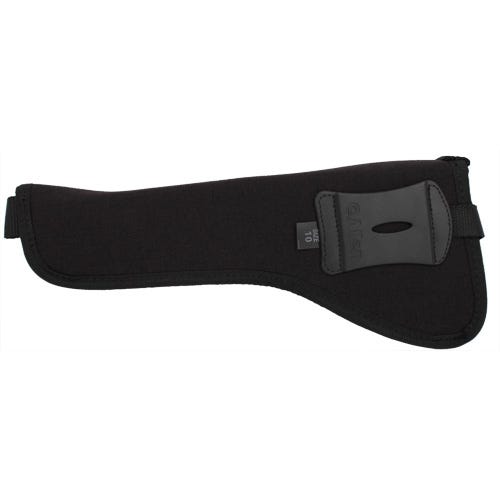 This black pistol holster features adjustable strap.Easy open snap with lever. Molded belt loop: Fits up to 2 belt. Smooth snag-proof lining with web sight guard.