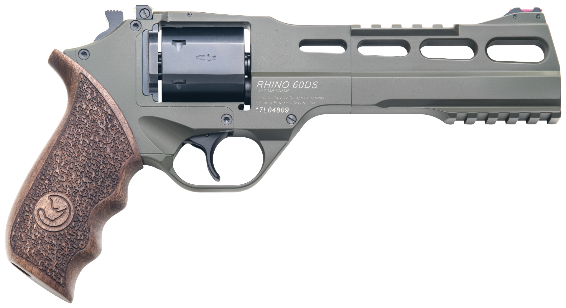 The Chiappa Rhino 60 SAR is the most innovative development in revolver technology in decades. It fires from the bottom of the cylinder rather than the top which dramatically reduces muzzle rise and recoil felt by lowering the axis of the bore almost to the palm of the shooters hand. An aluminum alloy frame and barrel shroud makes the Rhino 60 SAR lightweight and easy to carry. The snag resistant “hammer” is actually a cocking device because of the Rhino’s innovative completely enclosed firing mechanism which can be fired either single or double action. A cocked indicator is clearly visible to indicate the internal hammer status. Another innovation is the hexagonal cylinder which keeps the revolver’s width to a minimum. Included is a fiber optic front sight. This Chiappa single action model has a 6″ barrel and has a OD green frame and barrel finish, black cylinder, and walnut grip.
