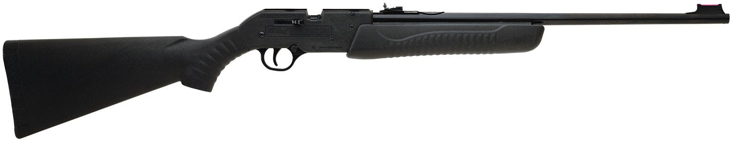 Daisy’s PowerLine Model 901 is a sleek, multi-pump air rifle. It features a black advanced-composite stock and forearm, fiber optic front and adjustable rear sights, and a rifled steel barrel. With a maximum muzzle velocity of 750 fps and a dovetail feature for mounting optics, this gun also fits the bill for small game hunting. This model shoots either BBs or pellets and can hold up to 50 BBs in the magazine.