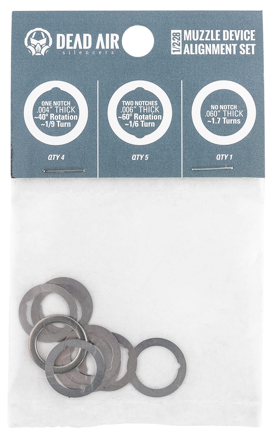 The Dead Air Shim Kit comes with shims in three different thicknesses—.004″, .006″, and .060″—offering a range of options for fine-tuning the alignment of your muzzle device. Specifically made for use with 3/4″-24 TPI thread patterns, the shims allow for a secure fit and precise alignment, eliminating the need for crush washers and ensuring proper timing of your muzzle device.