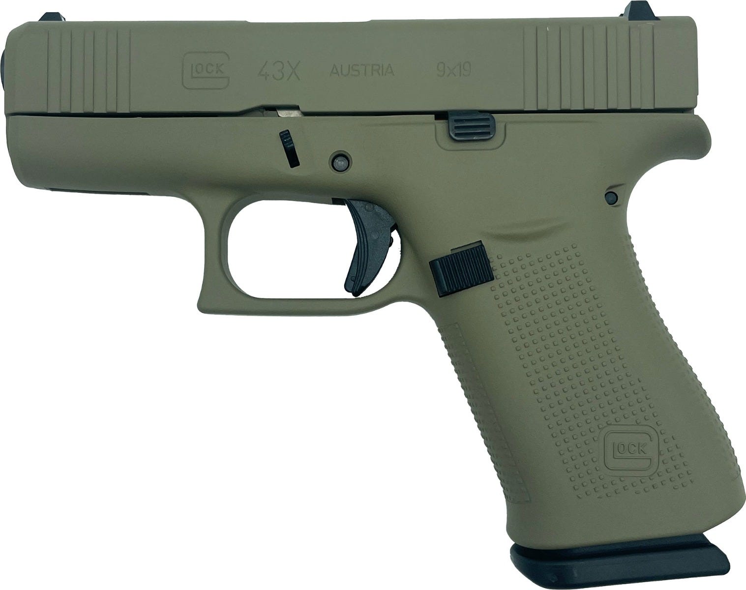 The Glock 43X combines a compact-size grip length, a built-in beaver tail and a subcompact-slim slide for a comfortably balanced, versatile grip thats ideal for a variety of users. It features the Glock Safe Action system which provides a consistent trigger pull from the first to the last round. The three automatic independently operating mechanical safeties are built into the fire control system of the pistol. All three safeties disengage sequentially as the trigger is pulled and automatically reengage when the trigger is released. The frame is made of polymer with hardened steel guides.