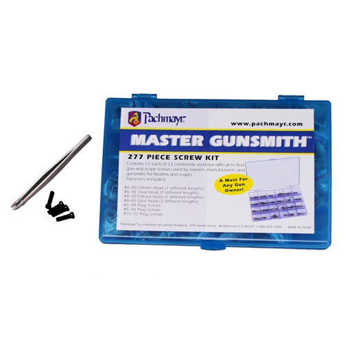 Pachmayr 03054 Master Gunsmith Screw Kit This set contains 12 each of 23 different hard to find screws that fit common applications in many guns. Screws are contained in a handy storage kit and includes tweezers.