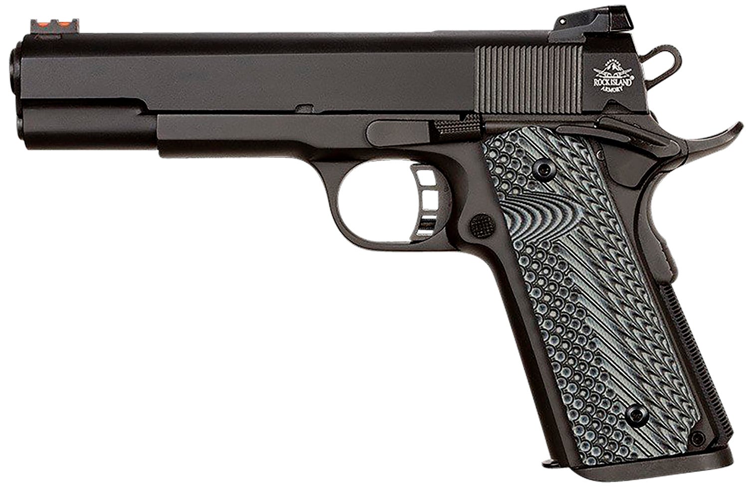 The Rock series is the Rock Island Armory most well-optioned line of 1911 pistols built in the traditional 70 series design with the addition of next level upgrades. Like all Rock Island 1911s, each is built using 4140 ordnance steel on the industry’s best CNC machines while being hand-fitted and tested to strict tolerance guidelines for unmatched quality and value. The Rock Ultra FS is built with a 5″ button rifled barrel supported by a full length guide rod. Smooth angled, snag-free style allows for quick draw in fast need situations. Includes LPA MPS1 Adjustable Type rear sight, a high visibility fiber optic front sight, skeletonized hammer and trigger with adjustable over travel stop and ambidextrous safety. Finished with a tough, parkerzied matte coating and comes with G10 tactical grips. True to all Rock Island 1911s, The Rock Island Rock Ultra FS comes with a crisp factory 1.36 kg – 1.81 kg trigger pull, making it a great experience right out of the box.