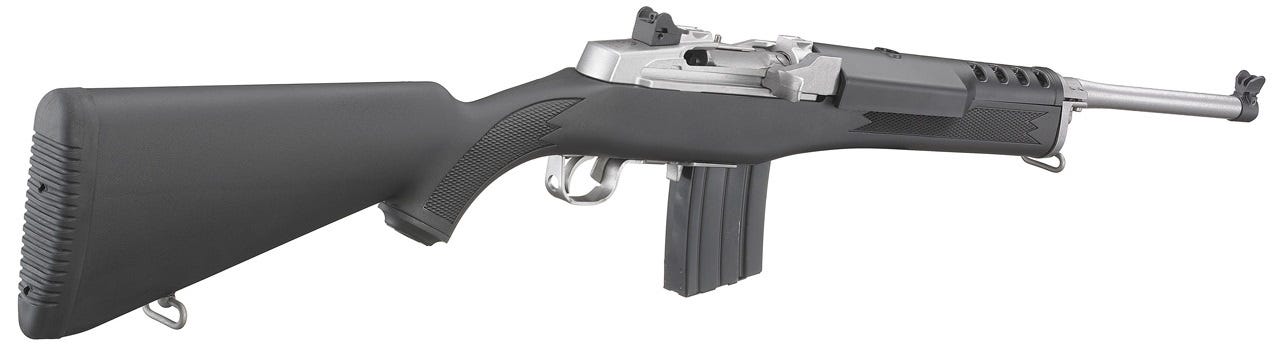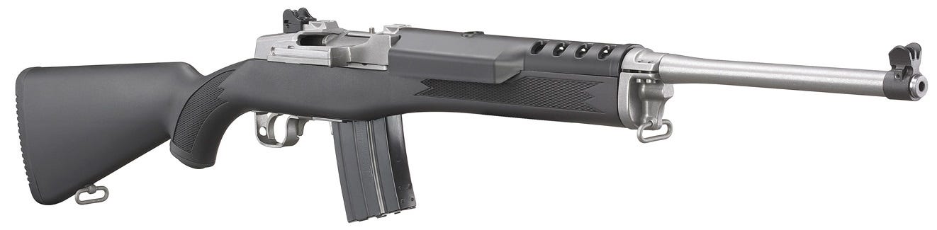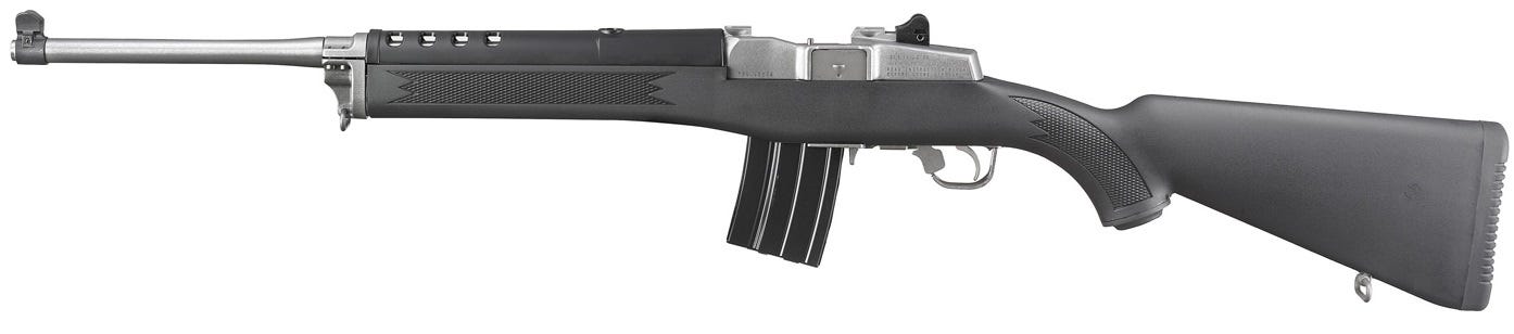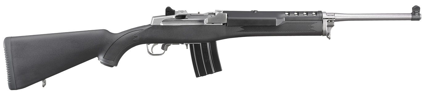The Ruger Mini-14 Ranch rifle offers inherent accuracy and quick repeat shot capability which makes it the favorite of ranchers and outdoorsmen. Its Garand-style action with breechbolt locking system, is a fixed-piston gas system and self-cleaning which gives unparalleled reliability under harsh operating conditions. The steel receiver is drilled and tapped, has a Picatinny rail, and integral scope mounts that provides a stable mounting surface. The Mini-14 Ranch also has a cold hammer-forged barrel and ghost ring adjustable rear and blade front sights. Included are two magazines and scope rings. This model has a 18.5″ stainless steel barrel and a black synthetic stock.