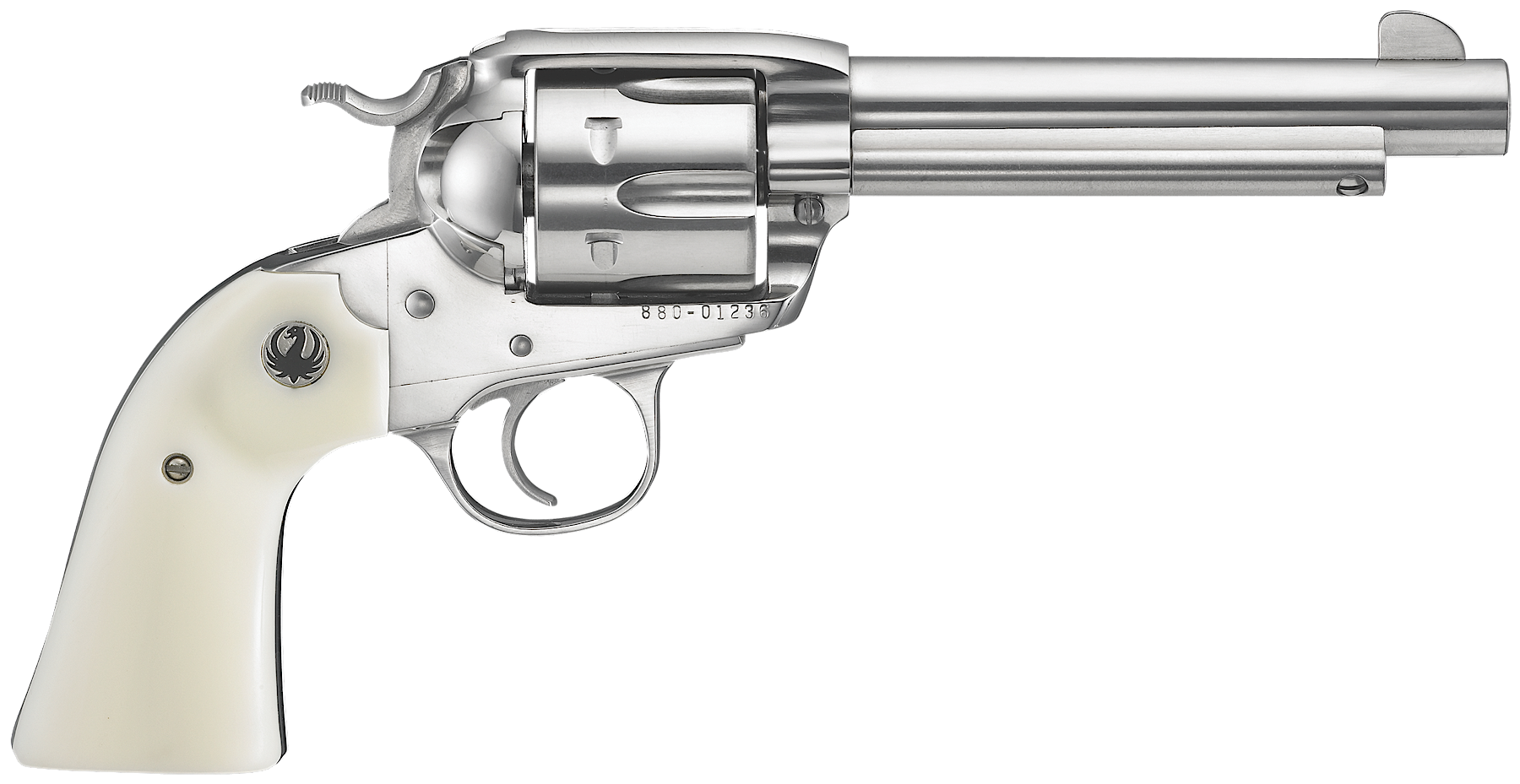 The transfer bar mechanism and loading gate interlock provide an unparalleled measure of security against accidental discharge. The Vaquero also has a traditional western-style, hand-filling grip and a cold hammer-forged barrel. This Ruger Bisley model is a 45 Colt featuring a Bisley style hammer, 5.5″ barrel, high-gloss stainless steel metal finish, and synthetic ivory grip.