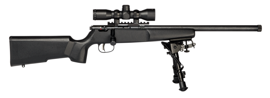 The Rascal Target XP comes with a mounted and boresighted 4x32mm scope, as well as a bipod sling swivel stud mount. It’s built for accuracy and adaptability, thanks to a precision hardwood stock, heavy 16 1/8-inch barrel, one-piece Picatinny rail and threaded (1/2-28) muzzle.