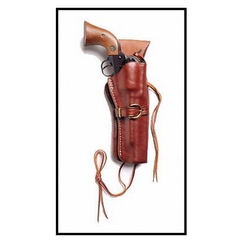 Made from a single layer of heavy 11-12 oz. saddle leather. 2 heavy-duty snaps, allows use on a straight or drop belt. Heavy thong and a leg tie-down. Suggested for use with #110 “Wyoming” belt. Single action revolvers only. Plain finish walnut.